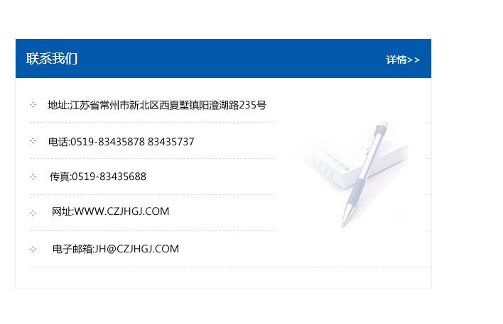 地址:常州市新北區友邦商務大廈1幢16、17層  電話:0519-85101652  傳真:0519-85112595  郵編:213022  網址:www_cz-jiayue_cn.axznkj.com  郵箱:xiajifengaa@163.com